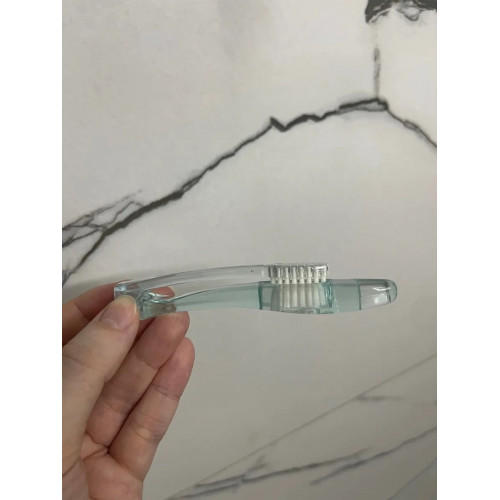 Удобная складная щетка, есть отверстие, чтобы щетка не прела в мокром сложенном виде. Нравится, что щетина правда мягкая и не травмирует эмаль, так как очень сложно почему-то найти трэвел-формат не с жесткой щетиной.